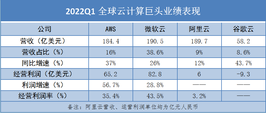 以2022Q1财报季为例,AWS经营利润为65.2亿美元,同比增长56.7%,而北美和国际业务由盈转亏,经营亏损分别为15.7亿美元、12.8亿美元;微软智能云经营利润为82.8亿美元,同比增速28.8%,高于生产力和业务流程、更多个人计算两大业务的经营利润同比增速。