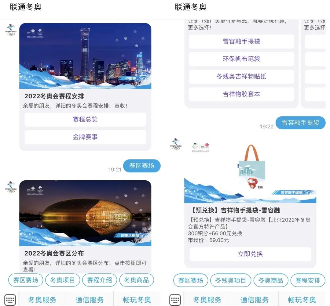 比如在 2022 年,联通为了冬奥推出的 5G 消息,基于短信原生窗口,无需登录和下载,支持中英双语,提供赛事介绍,推广联通服务,上架周边商品。
