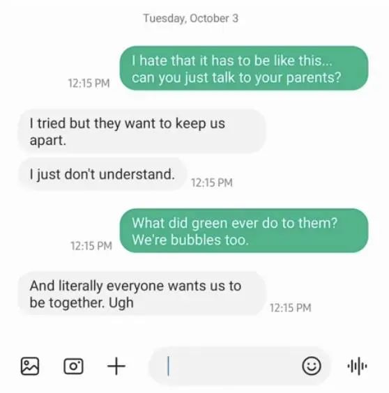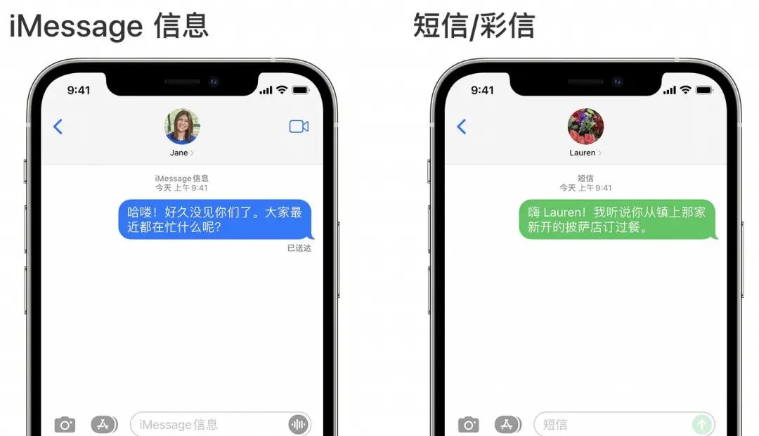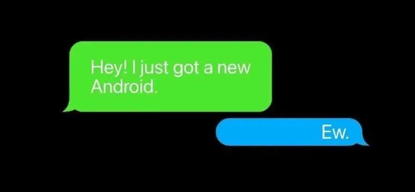 天差地别的体验,长着两张不同的脸。iPhone 之间的聊天气泡是蓝色的,但 iPhone 和 Android 之间的聊天气泡是绿色的。